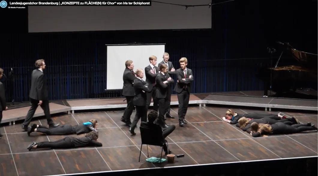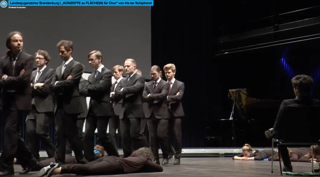 Die Komponistin Iris ter Schiphorst schuf mit 'Konzepte für Fläche(n)' eine Versuchsanordnung, aus der jeder Chor seine ganz eigenen Ideen entwickeln durfte: Das Spektrum der Darbietungen reichte von plastischer Konfrontation heterogener Lebensentwürfe und Musikwelten (LJC Sachsen-Anhalt) bis zur markanten flmischen Dokumentation des Arbeitsprozesses (LJC Brandenburg); und von der kraftvoll-spielerischen Performance zwischen Selbstbehauptung und sozialer Interaktion (LJC Baden-Württemberg) bis zur introvertierten Selbsterforschung, die überraschenderweise in ein «Ensemblekunstmanifest» einmündete (LJC Saar): "Ensemblekunst gehört dem Ensemble", so lautete der letzte der elf Kernsätze dieses Manifests, den man auch als ein Insistieren auf die Individualität der jeweiligen Formation verstehen kann.