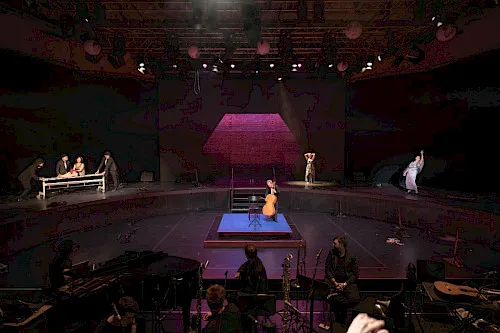 für eine Schauspielerin, einen singenden Cellisten, eine Sängerin, gemischtes Ensemble und Zuspiele